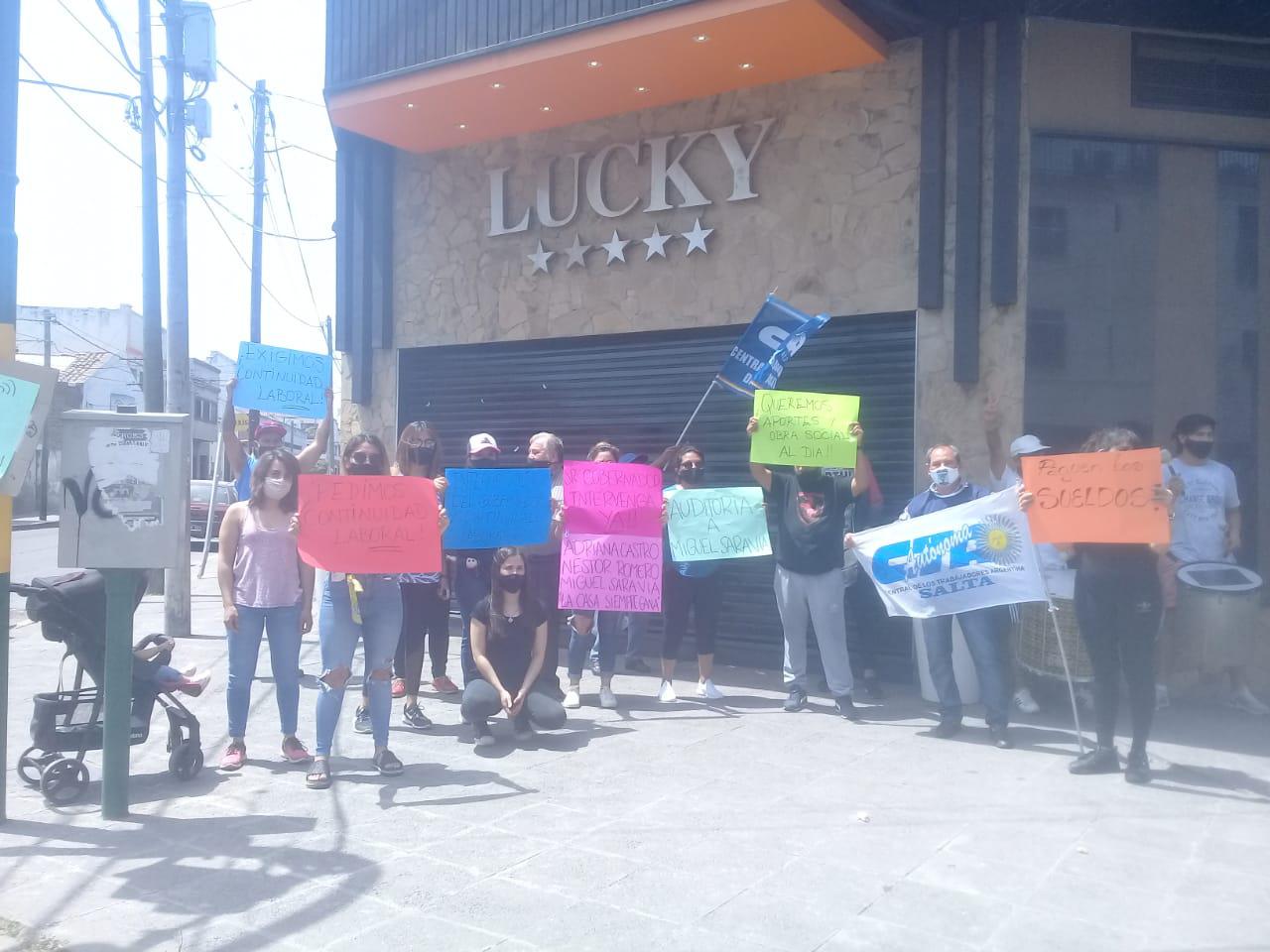 Los trabajadores de Casino Lucky cortaron la calle en las puertas del establecimiento que está ubicado en la esquina de Jujuy y San Luis. Reclaman que la empresa se haga cargo de todas las deudas que acumula contra ellos.