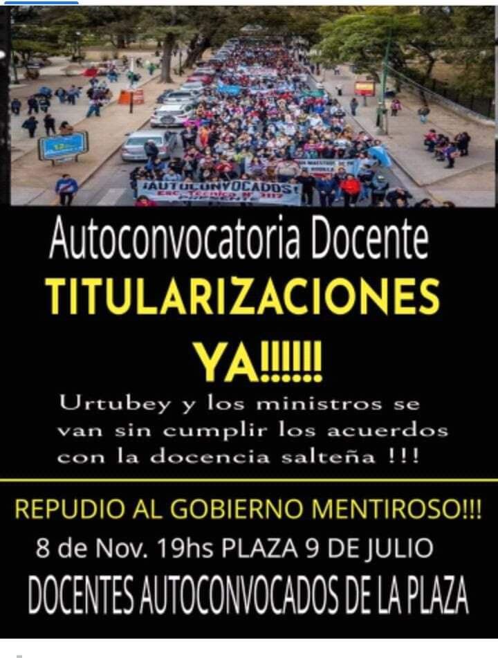 En esta oportunidad las tensiones de la docencia se manifiestan por el incumplimiento del gobierno de Juan Manuel Urtubey respecto a las titularizaciones, primero del área secundaria y finalmente de primaria.