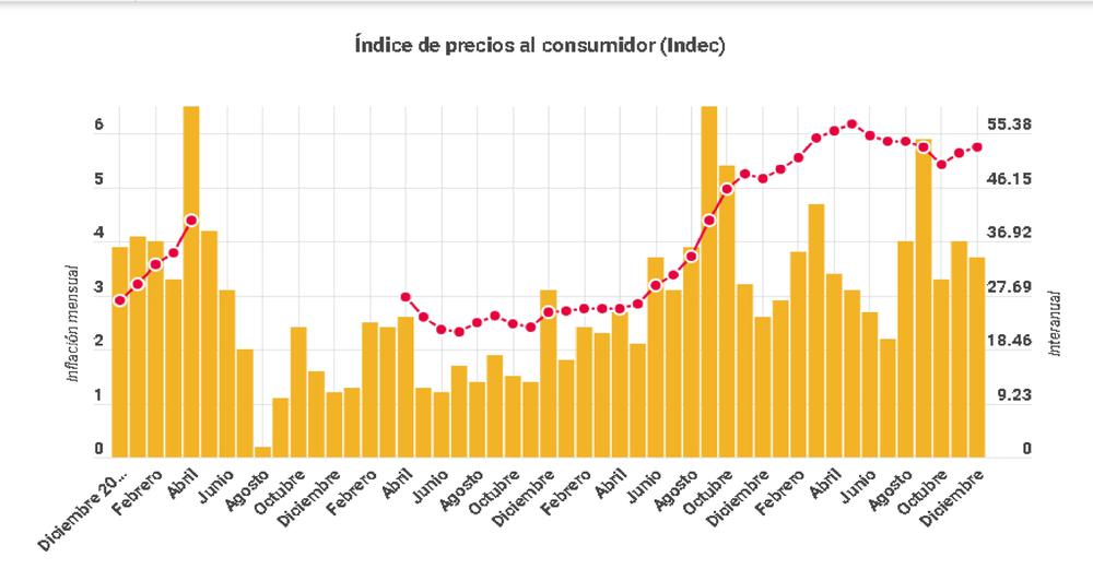 La inflación anual del año pasado, de esta manera, fue la más alta que registre la economía argentina desde 1991, cuando el país terminaba el proceso para salir de la hiperinflación. Ese año la suba de precios alcanzó el 84%. Ni siquiera tras el fin de la convertibilidad y la crisis económica de fines de 2001 hubo un índice tan alto, ya que en 2002 llegó a superar levemente el 40%.