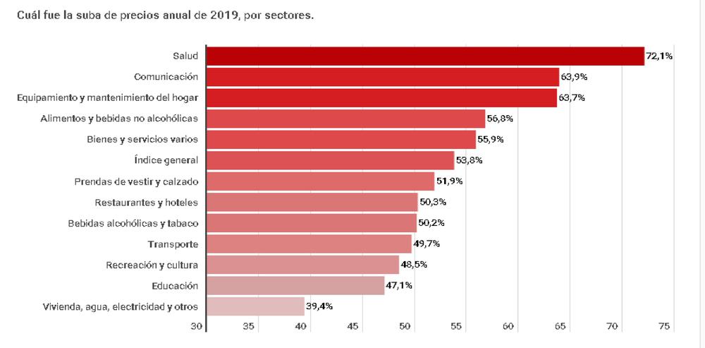 De punta a punta a lo largo de 2019 la inflación se sintió principalmente en remedios, medicina prepaga y los gastos de las familias en telefonía e internet. De acuerdo al organismo estadístico, el sector de salud tuvo una suba de precios de 72,1%. Para el rubro comunicación el incremento fue de 63,9%. Los alimentos tuvieron una suba de 56,8%.