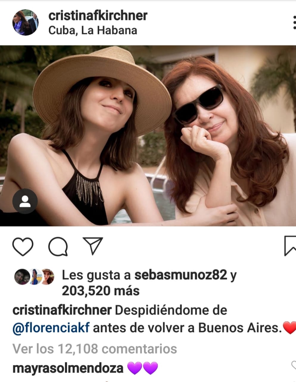 Cristina Kirchner compartió este martes en su cuenta de Instagram una fotografía junto con Florencia. Se trata de la primera imagen que se conoce de la joven desde que viajó a Cuba para realizar un tratamiento médico.
