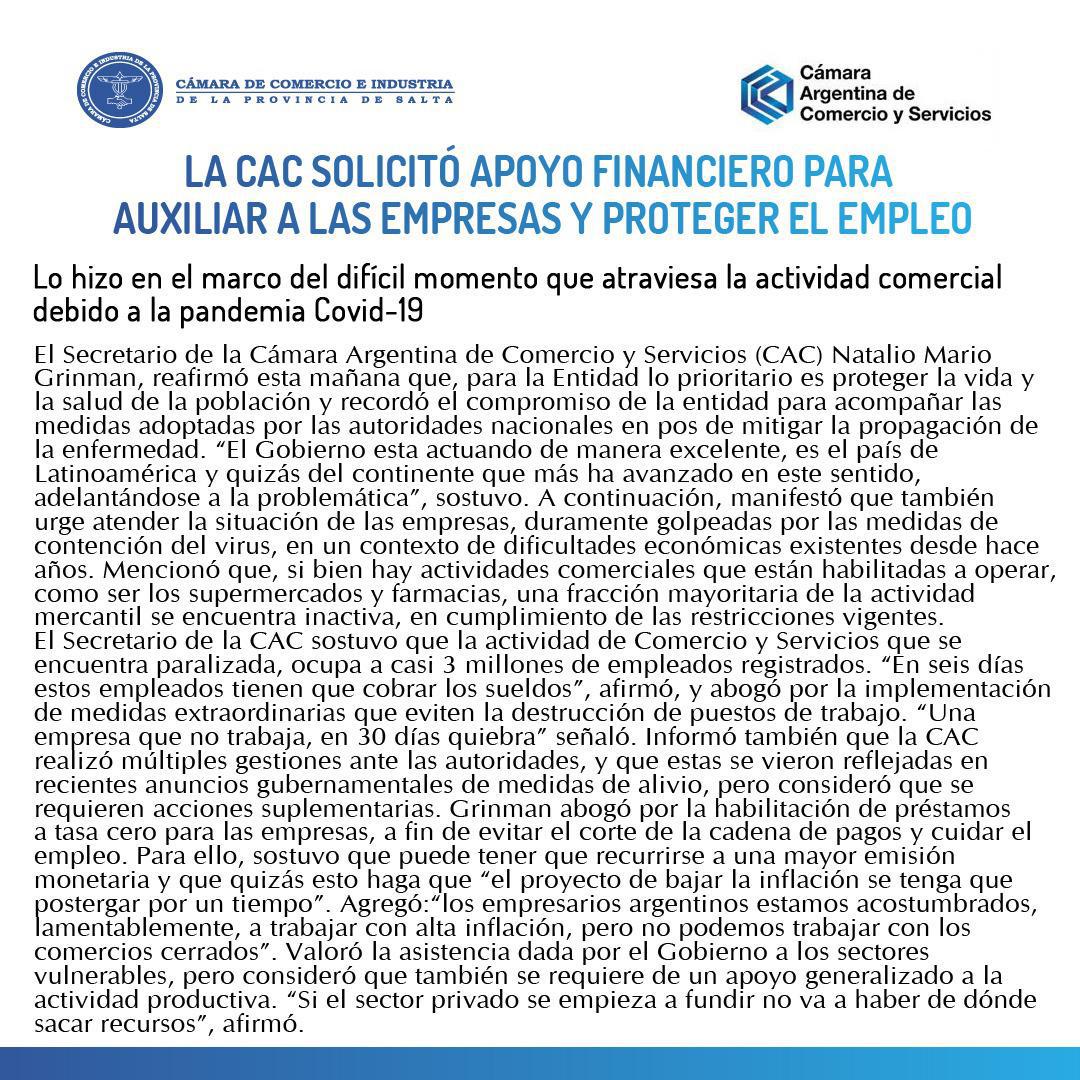 La Cámara Argentina de Comercio emitió un comunicado pidiendo un auxilio económico al Estado Nacional para poder afrontar la crisis sanitaria por la pandemia del coronavirus.