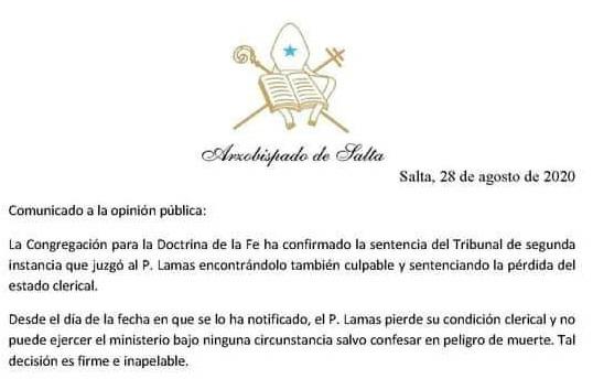 “En el día de la fecha P. Lamas pierde su condición clerical y no puede ejercer el ministerio bajo ninguna circunstancia”, agrega el texto.